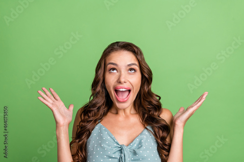Photo of young girl happy positive smile amazed shocked omg wow news discount look empty space isolated over green color background