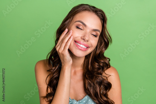 Photo of young girl happy positive smile hand touch cheek pure clean soft skin hydration isolated over green color background