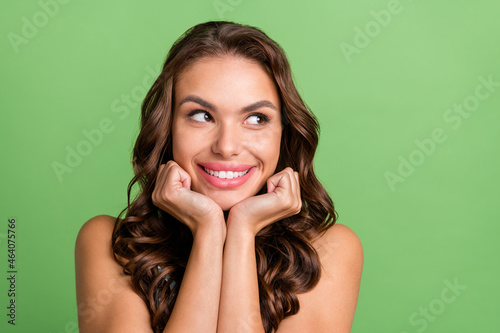 Photo of young girl happy positive smile hands touch cheeks curious dreamy look empty space isolated over green color background