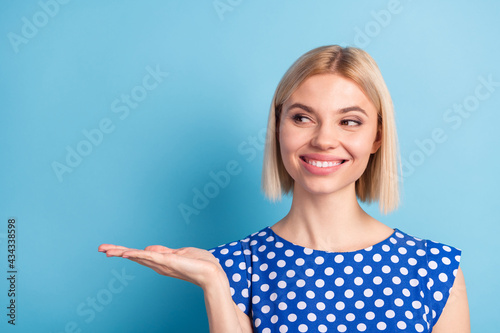 Photo of young girl happy positive smile look present product offer advert suggest isolated over blue color background