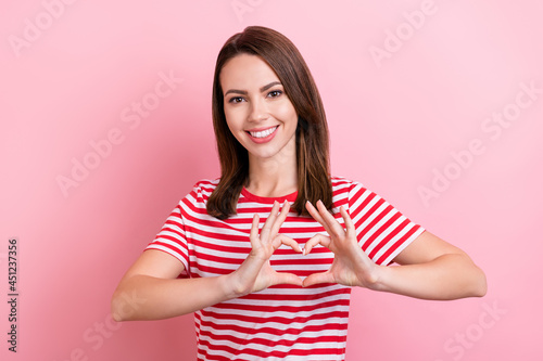 Photo of young girl happy positive smile show fingers heart symbol valentine day love isolated over pink color background