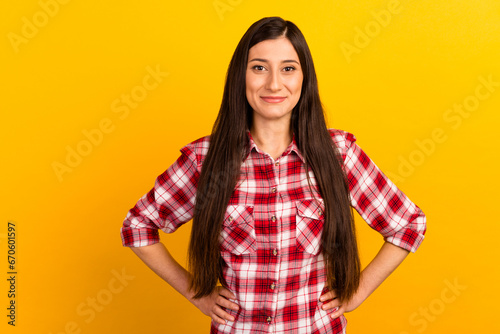 Photo of young girl smiling hold arms by sides professional isolated over yellow color background