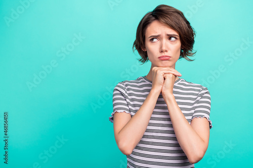 Photo of young girl unhappy sad upset offended depressed look empty space isolated over teal color background