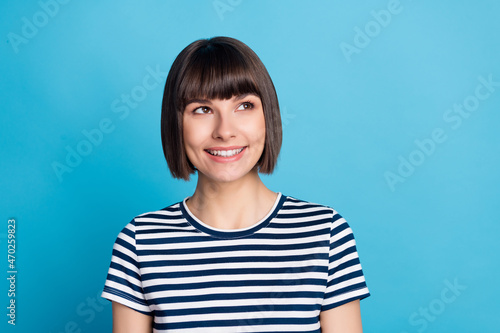 Photo of young happy charming dreamy woman look empty space smile isolated on blue color background