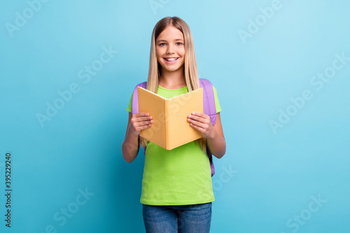 Photo of young happy positive good mood girl reding book wear purple rucksack isolated on blue color background