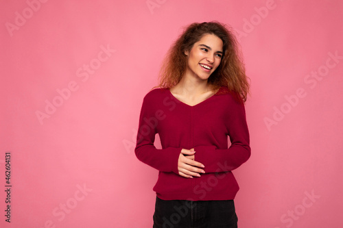 Photo of young happy positive pretty nice brunette wavy woman with sincere emotions wearing casual pink sweater isolated over pink background with empty space and having fun