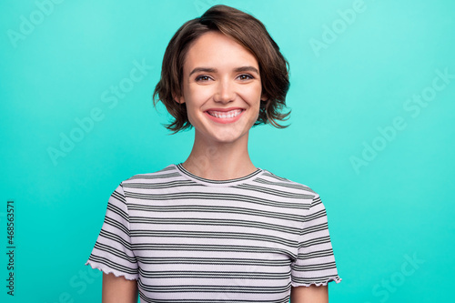 Photo of young happy pretty cheerful woman smile wear casual t--shirt isolated on teal color background
