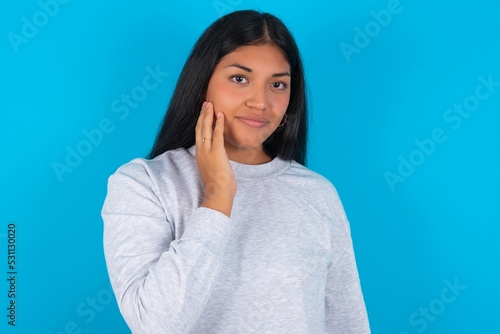Photo of Young latin woman wearing gray sweater blue background enjoy fresh perfect smooth skin touch face