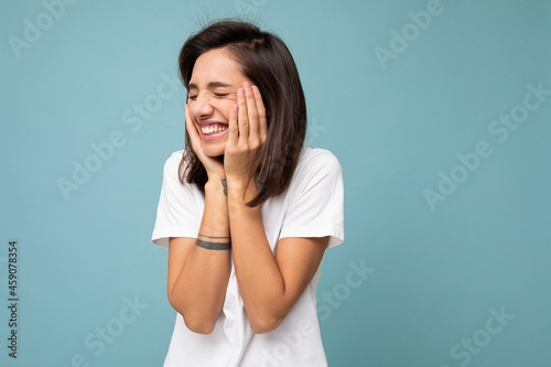 Photo of young positive happy smiling beautiful woman with sincere emotions wearing stylish clothes isolated over background with copy space