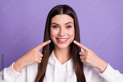 Photo of young positive happy woman point fingers face teeth whitening smile isolated on violet color background