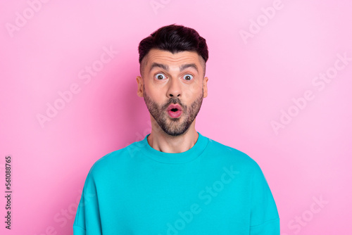 Photo of young pouted lips excited guy brunet hair impressed reaction shocked how expensive dollar cost currency isolated on pink color background