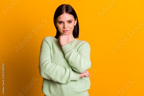 Photo of young pretty woman hand touch chin think confident smart isolated over yellow color background