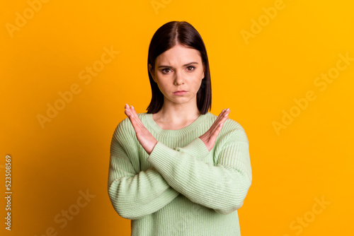 Photo of young woman crossed hands show no stop rejection ban block symbol isolated over yellow color background