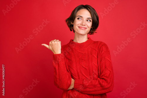 Photo of young woman happy positive smile point thumb empty space ad select sale isolated over red color background