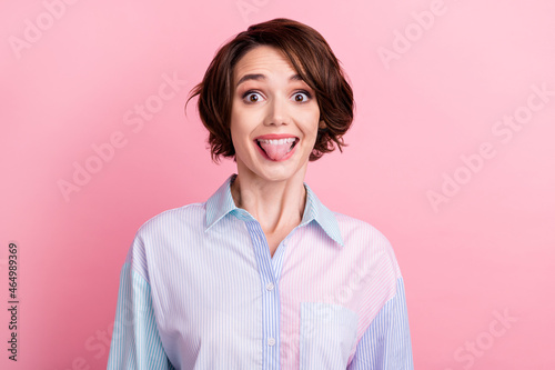 Photo portrait amazed woman cheerful fooling showing tongue isolated pastel pink color background
