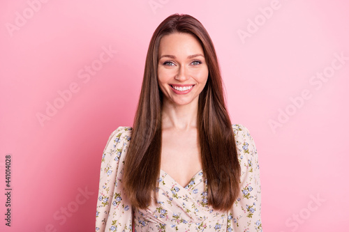 Photo portrait beautiful girl wearing pretty printed dress smiling happy isolated pastel pink color background