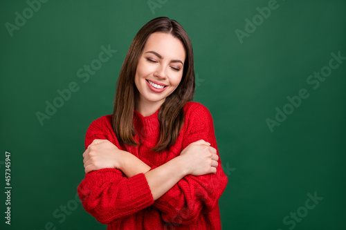 Photo portrait girl in red pullover dreamy embracing herself smiling isolated green color background