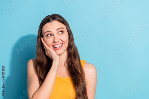 Photo portrait girl touching cheek looking copyspace surprised isolated pastel blue color background