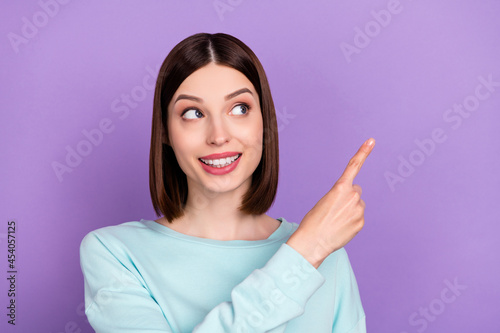 Photo portrait girl wearing blue pullover showing finger empty space isolated pastel violet color background