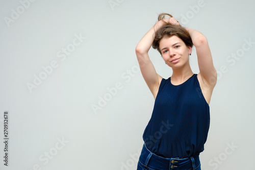 Photo portrait of a beautiful sexy brunette woman girl, smiling and pleased with life, with long flowing dark hair on a white background.