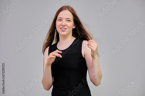 Photo portrait of a beautiful young pretty girl with dark red hair on a gray background in a black jacket. It stands directly in front of the camera in various poses, smiling, happy with life.