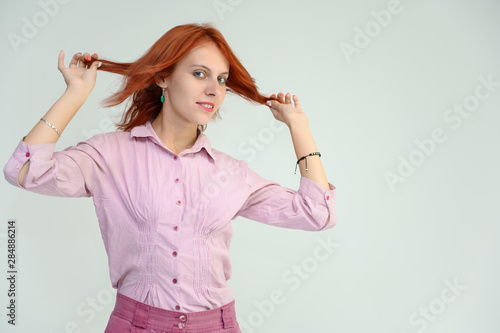 Photo Portrait of a cute girl woman with bright red hair manager in a pink shirt on a white background in studio. He talks, shows his hands in front of the camera with emotions.
