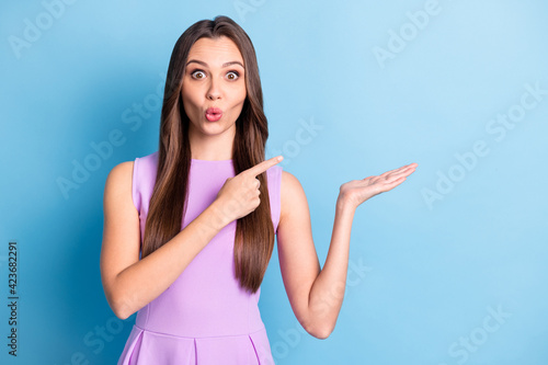 Photo portrait of amazed girl demonstrating empty space keeping on palm staring isolated on vivid blue color background