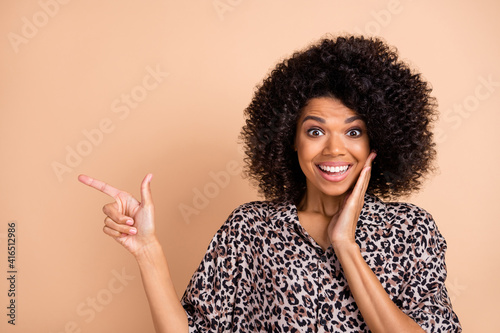Photo portrait of amazed girl touching cheek pointing finger blank space advising isolated pastel beige color background