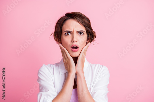Photo portrait of angry depressed girl touching cheeks staring opened mouth stressed isolated on pink pastel color background