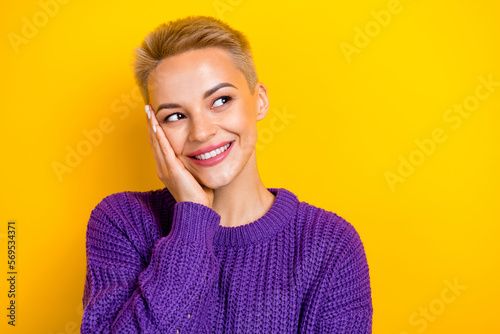 Photo portrait of attractive charming lovely blonde hair lady touch cheek palm look empty space dream boyfriend isolated on yellow color background