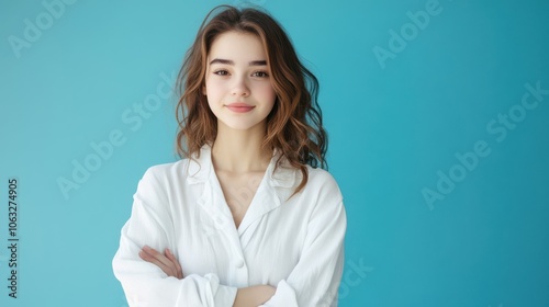 Photo portrait of attractive teen woman crossed hands confident dressed stylish white clothes isolated on blue color background