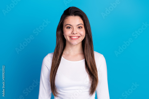 Photo portrait of attractive teen woman look camera toothy smile dressed stylish white clothes isolated on blue color background
