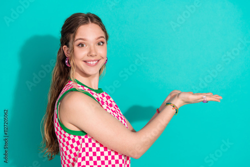 Photo portrait of attractive teen woman profile hold empty space dressed stylish checkered pink clothes isolated on cyan color background