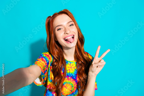 Photo portrait of attractive young girl selfie photo stick tongue v-sign dressed stylish colorful clothes isolated on cyan color background