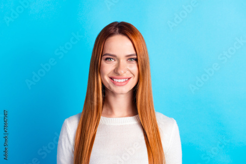 Photo portrait of attractive young woman smile look camera dressed stylish white clothes isolated on blue color background