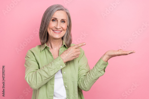 Photo portrait of charming senior woman grey hair advertiser direct finger holding palm new vitamins isolated on pink color background