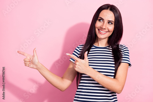 Photo portrait of curious woman pointing empty space smiling choosing isolated on pastel pink color background