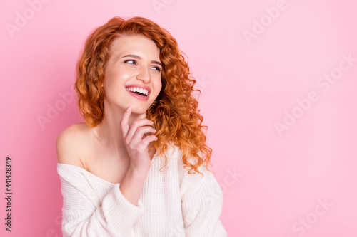 Photo portrait of curly girl smiling in sweater with off-shoulder looking copyspace touching chin isolated pastel pink color background