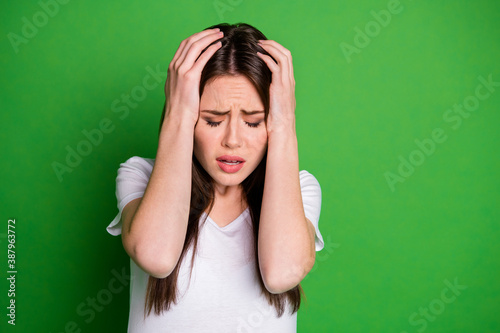 Photo portrait of depressed crying woman holding head with two hands isolated on vivid green colored background