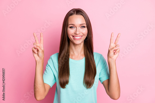 Photo portrait of female student staring showing v-sign with both hands smiling isolated on pastel pink color background