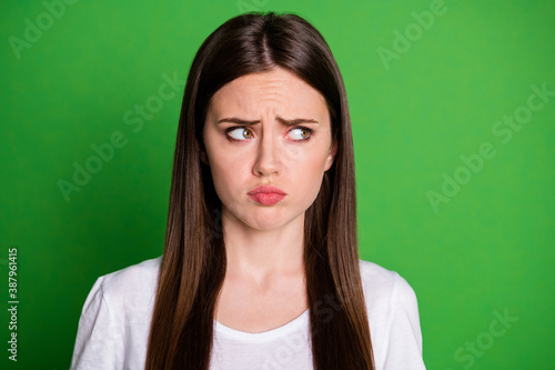 Photo portrait of frowning sad girl looking to side isolated on vivid green colored background