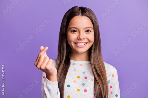 Photo portrait of girl making korean heart with fingers isolated on bright purple colored background