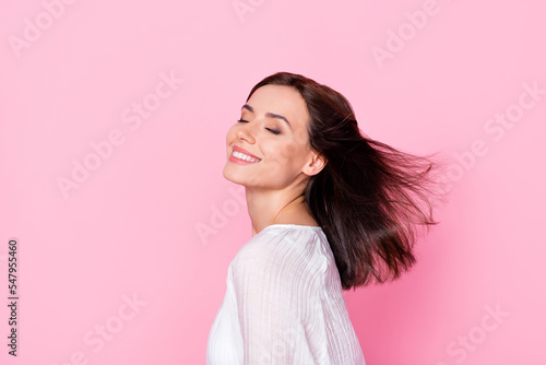 Photo portrait of gorgeous young lady closed eyes enjoy fresh spring wind wear trendy white clothes isolated on pink color background