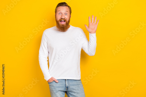 Photo portrait of handsome young guy toothy smile wave arm friendly greetings dressed trendy white look isolated on yellow color background