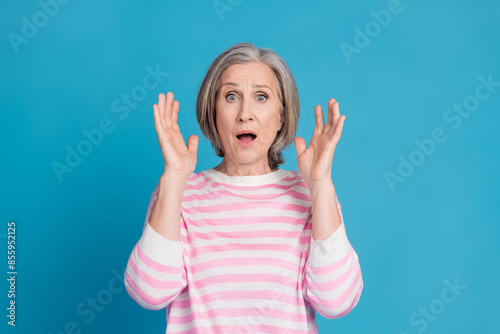 Photo portrait of lovely pensioner lady afraid raise hands dressed stylish striped garment isolated on blue color background