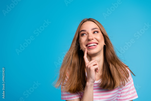Photo portrait of lovely pretty cheerful woman wear stylish striped pink clothes empty space isolated on blue color background
