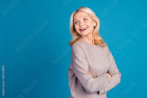 Photo portrait of lovely senior lady crossed hands look empty space dressed stylish gray garment isolated on blue color background