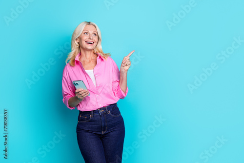 Photo portrait of lovely senior lady hold gadget point empty space wear trendy smart casual garment isolated on cyan color background