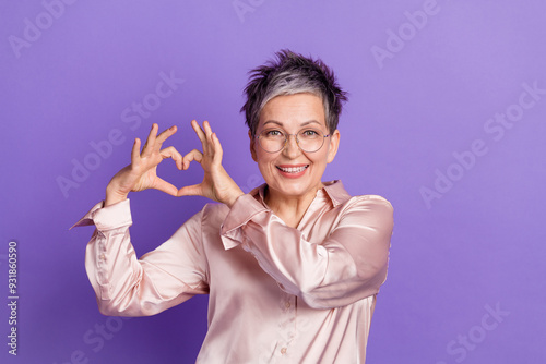 Photo portrait of lovely senior lady show heart gesture dressed stylish satin garment isolated on violet color background