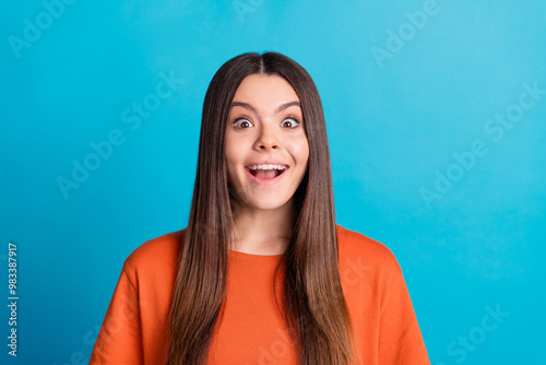 Photo portrait of lovely teen lady excited amazed cheerful dressed stylish orange garment isolated on blue color background